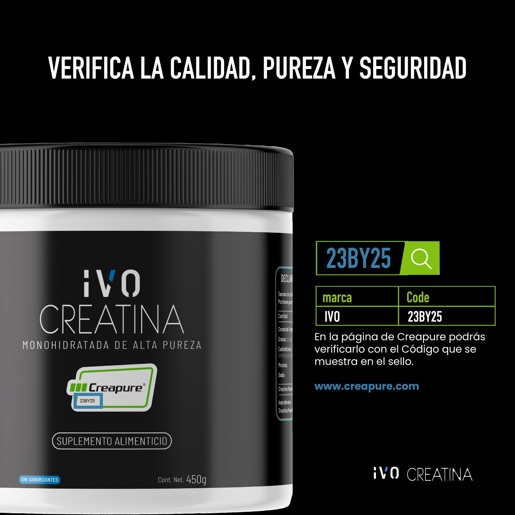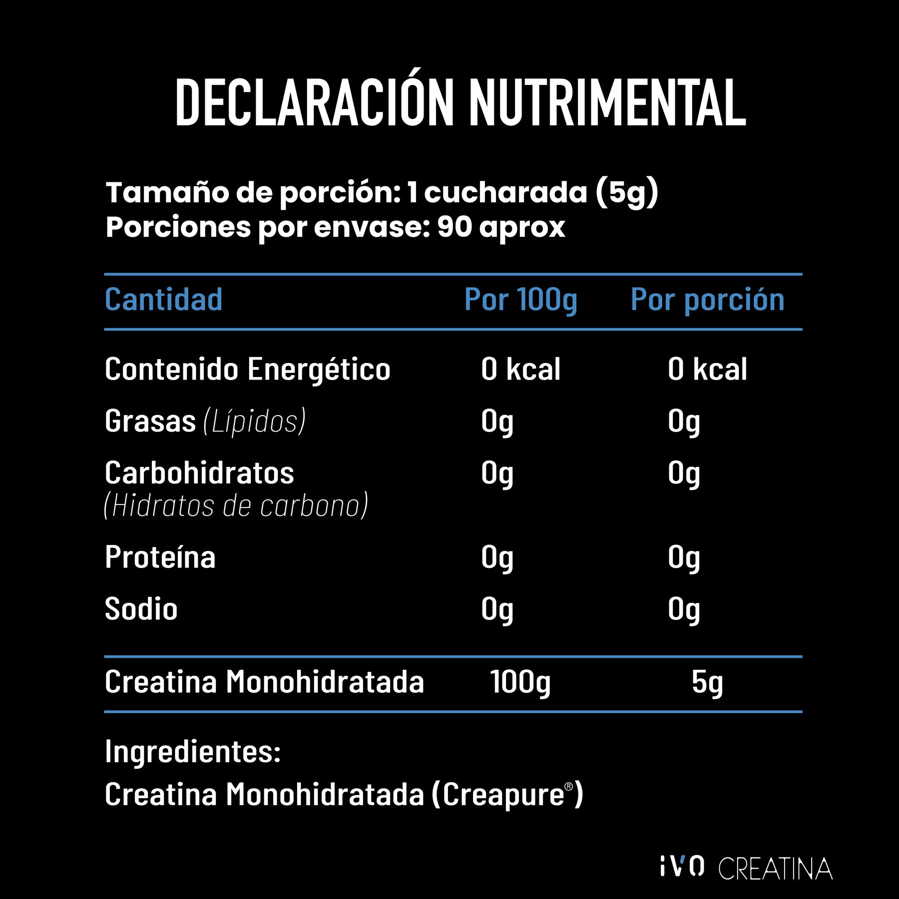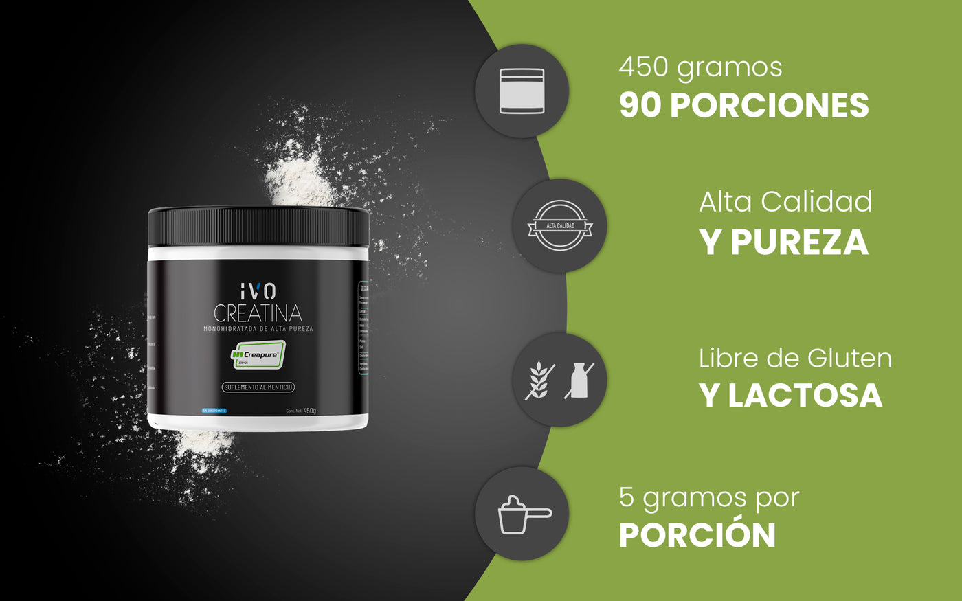 Creatina Monohidratada IVO: Un complemento para tu rutina diaria. Este producto ha sido desarrollado pensando en aquellos que buscan un complemento para su estilo de vida activo. Nuestra creatina proporciona 5 gramos por porción de creatina de alta pureza.